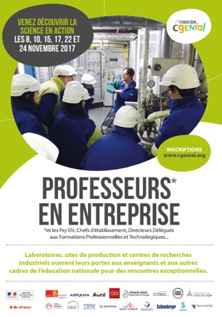 L’opération Professeurs en entreprise 2017 est proposée dans les académies suivantes : Aix-Marseille, Amiens, Besançon, Bordeaux, Clermont-Ferrand, Créteil, Dijon, Grenoble, Lille, Lyon, Montpellier, Nancy-Metz, Nantes, Nice, Orléans-Tours, Paris, Poitiers, Reims, Rennes, Rouen, Strasbourg, Toulouse et Versailles.Plus d’informations sur le site : http://www.cgenial.org/