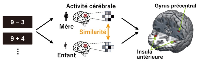 Dans un premier temps, les scientifiques ont cherché à voir si les régions cérébrales activées lors du calcul arithmétique étaient organisées de façon similaire entre le groupe des mères et le groupe des enfants, indépendamment du lien familial. Ces analyses ont permis de montrer une importante similarité d’activité cérébrale entre les deux groupes dans plusieurs régions du cortex pariétal, du cortex frontal, et de l’insula. Cela suggère que le calcul arithmétique mobilise des réseaux neuronaux relativement similaires d’une génération à l’autre.