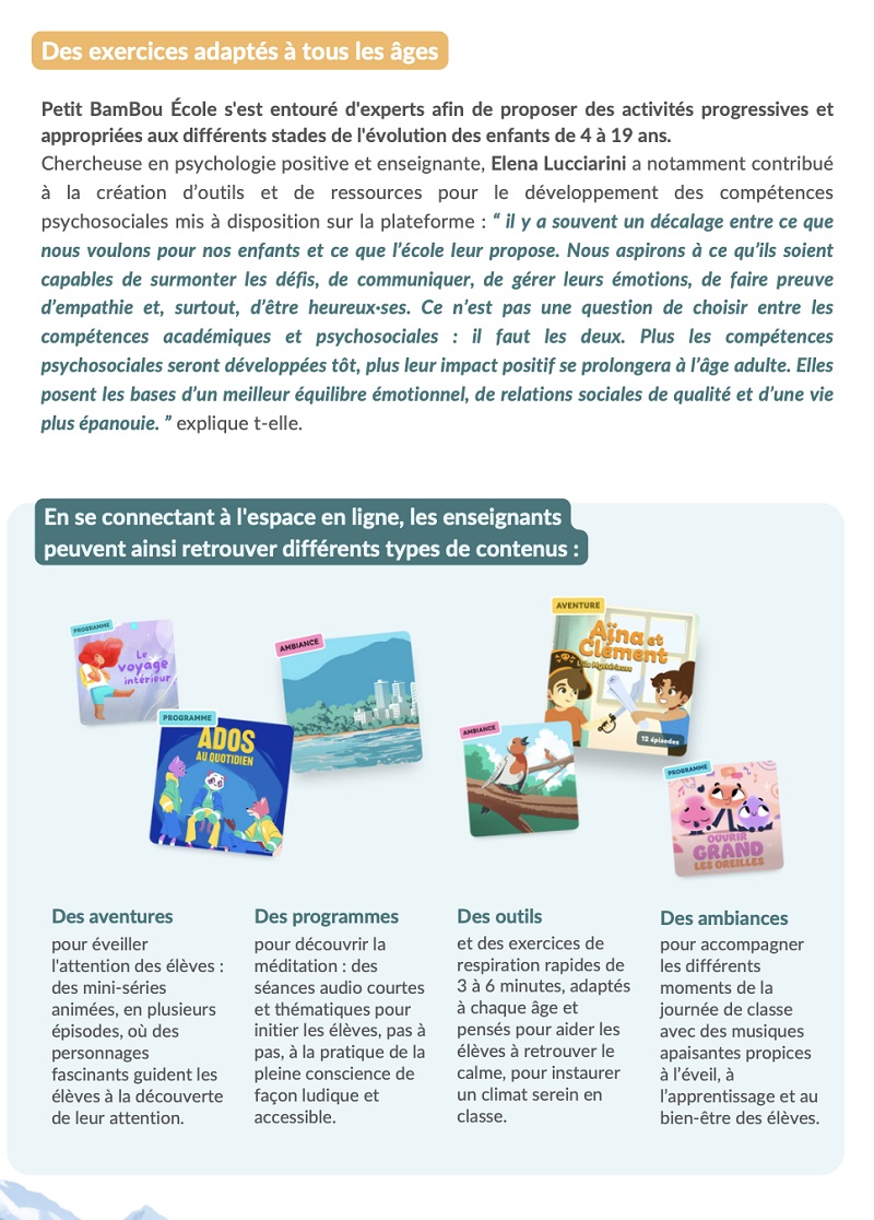Face à ce constat, et dans le cadre de la Grande Cause Nationale 2025 consacrée à la santé mentale, Petit BamBou, leader européen de la méditation de pleine conscience (12 millions d’utilisateurs dans 191 pays, plus de 1 400 séances disponibles), lance Petit BamBou École. Cette plateforme gratuite, déjà adoptée par plus de 7 000 classes, met à la disposition des enseignants des méditations guidées, des exercices de respiration et des ambiances sonores adaptées aux élèves de 4 à 12 ans. Objectif : offrir aux plus jeunes un espace pour souffler, se recentrer… et grandir plus sereinement dans un monde en perpétuelle accélération.