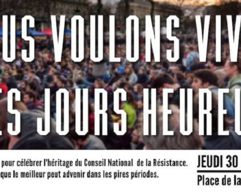 Les Jours Heureux et Nuit Debout Paris République vous invitent à participer à une rencontre pour célébrer l’héritage du Conseil National de la Résistance le jeudi 30 mars. Il s’agit de préparer le premier anniversaire de Nuit Debout, le rendez-vous des Printemps 2017 le dimanche 2 avril et l’accueil de