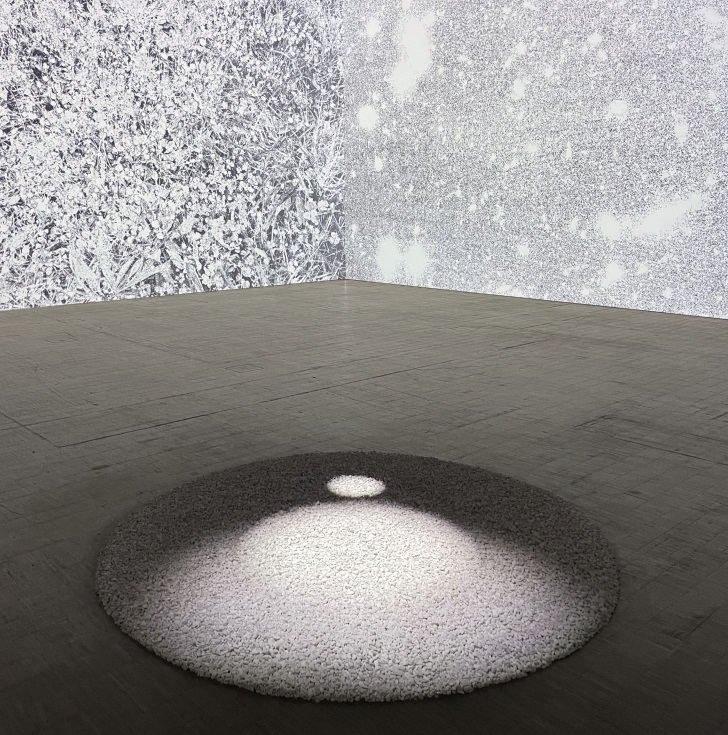 Les Mers de lune met en scène les noms des régions lunaires sous la forme d’une composition visuelle et sonore où des gouttes de lumière tombent sur une surface minérale. Cette pièce imaginée par le duo d’artistes à l’occasion d’une résidence au Japon, s’inspire des jardins secs de ce pays, très dépouillés, faits de sable, de gravier ou de pierres blanches.