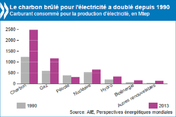Le charbon produit 40 % de l’électricité mondiale et représentait 44 % des émissions de CO2 en 2012 (830 millions de personnes ont eu accès à l’énergie ces vingt dernières années grâce au charbon). Les experts scientifiques du changement climatique estiment que 88 % des réserves actuelles (ainsi que 35 % des réserves de pétrole et 52 % de celles de gaz) doivent être laissées sous terre pour permettre à la planète de limiter la hausse de la température moyenne à + 2 °C d’ici à 2050. Cet objectif, qui fait consensus au sein de la communauté internationale, doit faire l’objet de l’accord espéré en fin d’année à Paris lors de la conférence sur le climat COP21.