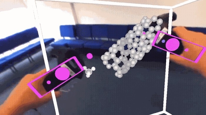 Il y a quelques mois, une équipe britannique de l’Université de Bristol dirigée par David Glowacki a, pour sa part, créé un environnement virtuel pour simuler des structures moléculaires 3D. Les utilisateurs, qui portent des casques de réalité virtuelle, utilisent des contrôleurs de mouvement portatifs pour manipuler les molécules (Source : Nature). Cette modélisation s’appuie sur un calcul distribué sur le cloud et cet outil permet aux chercheurs de comparer des modélisations informatiques avec les données de recherche.
