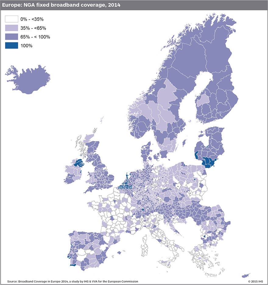 La carte ci-dessous fait apparaître que 65 % des territoires de notre pays ne sont pas couverts par le haut-débit et s’enlisent dans ce que les spécialistes appellent des « zones blanches ». La France est largement distancée par les Pays baltes, l’Islande, l’Irlande du Nord et même l’Espagne. Seules la Grèce et l’Italie semblent avoir une couverture internet moins développée.