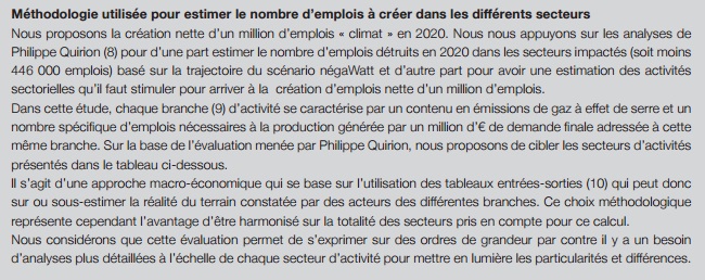 Pour arriver à un million d’emplois « nets » en 2020, il est nécessaire de créer 1,5 million de postes afin de compenser les pertes d’emplois qui se produiront dans certains secteurs d’activités impactés comme les centrales au charbon et le transport routier. Dans la proposition, les secteurs concernés par la création d’emplois-climat couvrent un champ volontairement large d’activités, celles estimées nécessaires pour permettre une transition écologique juste. En effet, plus que jamais, celle-ci doit s’étendre et s’ancrer dans toutes les activités de notre vie quotidienne : l’éducation, la recherche, l’accompagnement des ménages en difficulté, l’aide à la personne, les activités extrascolaires, des expositions artistiques etc.