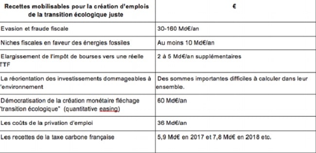 Le rapport montre qu’une transition écologique riche en emplois de bonne qualité est possible. Et qu’elle peut être financée : la longue liste des niches fiscales défavorables à la transition écologique et la perte de recettes due à la fraude et à l’évasion fiscale sont les gisements qu’il faut exploiter pour financer la transition en complément de la nécessaire reprise en main du crédit.