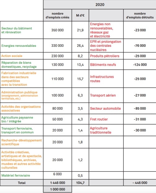 Il s’agit donc d’un appel dès maintenant à des investissements publics et des politiques orientant les secteurs privés et la formation vers la création d’un million d’emplois additionnels dans des secteurs qui sont considérés comme cruciaux : énergies renouvelables, rénovation des bâtiments, auto-rénovation accompagnée, identification et accompagnement des ménages en précarité énergétique, agro-écologie, infrastructures de transport durable, recyclage, réparation et réutilisation, accompagnement des PME/TPE et des collectivités dans l’application des politiques de la transition écologique, éducation aux enjeux de la transition écologique, adaptation aux effets du réchauffement climatique, etc.