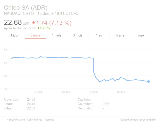 Mais la belle histoire risque de tourner au vinaigre. L’action de Criteo au Nasdaq a brutalement chuté jeudi dernier et semble ne pas pouvoir se relever. Les prémisses de la crise avaient commencé en novembre dernier. Apple avait annoncé la suppression au bout de 24 heures des cookies tiers sur ses appareils sous IOS 11. « La technologie de ciblage publicitaire est devenue si invasive qu’il est possible pour les publicitaires de recréer l’historique web d’une majorité d’internautes. Ces informations sont collectées sans permission » déclarait la marque à la pomme.