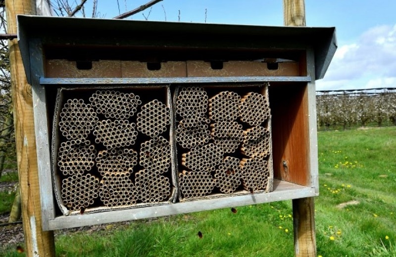 Abris d’abeilles osmies installés dans un verger près d’Agen pour aider à polliniser les arbres