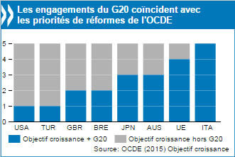 Les analyses d’Objectif croissance constituent le fondement de la contribution plus vaste de l’OCDE au Cadre du G20 pour une croissance forte, durable et équilibrée et pour ses Stratégies Nationales de Croissance. Les recommandations formulées dans cette publication ont contribué à l’élaboration de ces stratégies nationales de croissance approuvées par les chefs d’État et de gouvernement du G20 au cours du Sommet de Brisbane, en novembre 2014. Ces stratégies visent à accroître le produit intérieur brut (PIB) de l’ensemble des pays concernés de 2 % au cours des cinq années à venir. Elles peuvent également contribuer à fournir des indications plus claires sur l’orientation et la pérennité des décisions prises par les pouvoirs publics, ce qui est important pour renforcer la confiance.
