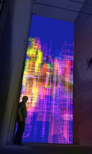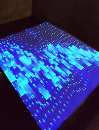 Cette projection est une succession aléatoire de différents tableaux graphiques multicolores composés de milliers de motifs en référence au monde numérique. Trames de pixels, symboles graphiques liés au digital (claviers d’ordinateur, USB, ON/OFF, clef USB…) composent une vague aux mouvements plus ou moins lent. Cet univers fluide de flux et reflux perturbe les perceptions des visiteurs en créant une sensation d’un fond aquatique fluide vivant projeté sur ce socle de béton immergé dans l’eau.