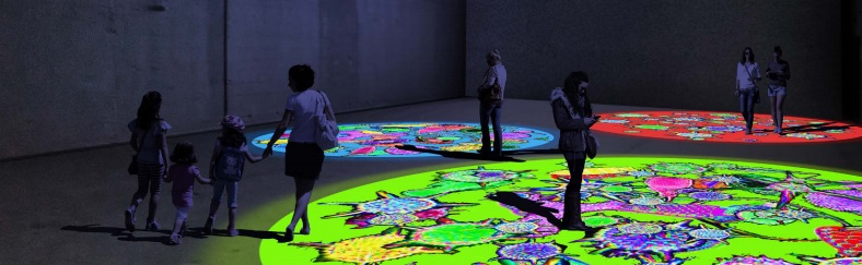 Digital Abysses est une série de projections au sol telles des bulles d’eau. A la surface de ces tapis de lumière se développent en temps réel différents organismes virtuels – radiolaires, protistes, plancton … – qui réagissent aux déplacements des visiteurs comme pour insister sur l’action de l’homme sur la nature. Cette installation plonge les visiteurs dans un univers intriguant, amplifiée par la musique du compositeur Michel Redolfi.