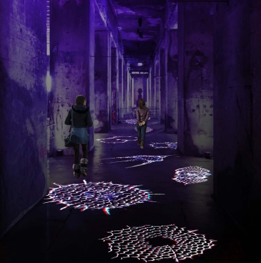 Cette installation s’inspire de la biologie, des micro-organismes marins et des automates cellulaires. Les déplacements des visiteurs créent des perturbations, des ondulations, dans la trajectoire de ces cellules. Les courbes sinueuses qui ondulent, renouent avec les influences psychédéliques des années 70 et perturbent les sens tel les vertiges des profondeurs.