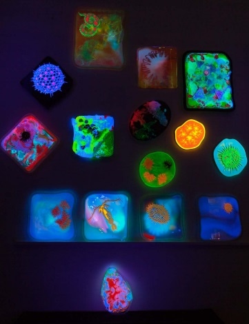 Miguel Chevalier revisite le cabinet de curiosités du XVIe et XVIIe siècles, et propose 4 différents cabinets de curiosités contemporain composés de sculptures réalisées par impression 3D, vidéos, impressions numériques, tableaux en résine Dacryl, gravures et découpes laser… Ces œuvres s’inspirent de la faune et la fore sous-marine, plus particulièrement des coraux, des méduses, du plancton animal microscopique, tels que les radiolaires. Ces œuvres luminescentes, plongées dans l’obscurité, entre réalité et fiction, mettent en scène une sorte de carnet de voyage imaginaire. Ces « merveilles » en tous genres, provoque ici surprise, fascination et méditation sur un monde recréé de toutes pièces.