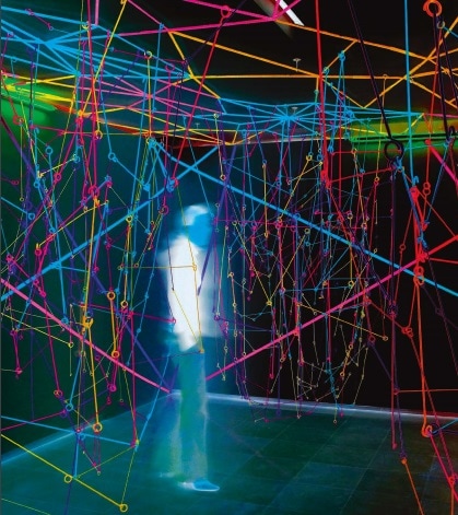 Aussi légère qu’aérienne, cette immense installation est suspendue au plafond telle une jungle d’algues de kelp luminescentes. Réalisée à partir d’un assemblage de 1 500 micro structures fuo imbriquées les unes aux autres et éclairées aux ultraviolets, elle surgit de l’obscurité tel un rhizome de lumière.
