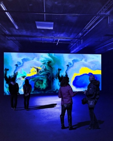 Installation de réalité virtuelle générative et interactive 9 m x 2,90 m Logiciels : Cyrille Henry et Antoine Villeret Pour cette installation de réalité virtuelle, l’artiste propose une peinture dynamique générative et interactive. L’œuvre représente un univers liquide ou gazeux qui évoque les flux dégagés par les monts hydrothermaux (formations géologiques de cheminées dans les profondeurs des mers). Le déplacement du spectateur créé une traînée de couleur sombre qui se mélange et fuse avec l’œuvre avant de s’effacer lentement jusqu’au prochain passage d’un visiteur. Pixels Liquides 2018 s’inspire de la peinture gestuelle des années 50 où les artistes faisaient corps avec leur toile, ici ce sont les visiteurs qui font corps avec l’écran.