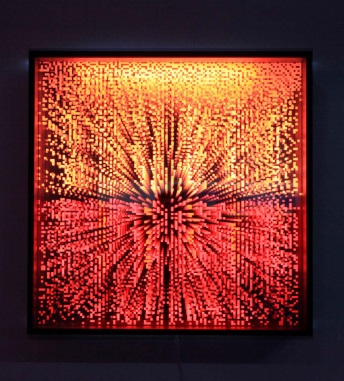 Le parcours de l’exposition est ponctué d’œuvres lumineuses en 2D qui invitent le visiteur à plonger dans l’univers infini de la lumière. Ces œuvres se composent de différentes trames de pixels mises en abyme par un double miroir sans teint. A l’inverse des recherches menées dans les années 60 par des artistes comme Alain Jacquet ou Roy Lichtenstein, Miguel Chevalier développe ici une écriture non plus fondée sur l’agrandissement d’une trame de points offset, mais sur une trame de pixels. Il s’agit d’une approche spécifique de l’art numérique où le pixel devient l’élément de base tel une iconographie de notre société du 21e siècle.