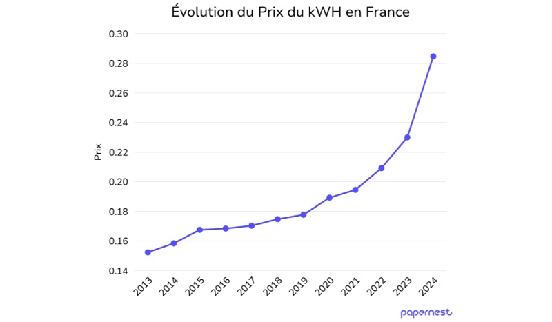 ● +86 % : augmentation du prix moyen du kWh en 10 ans, passant de 0,1524 €/kWh (2013) à 0,2847 €/kWh (2024).