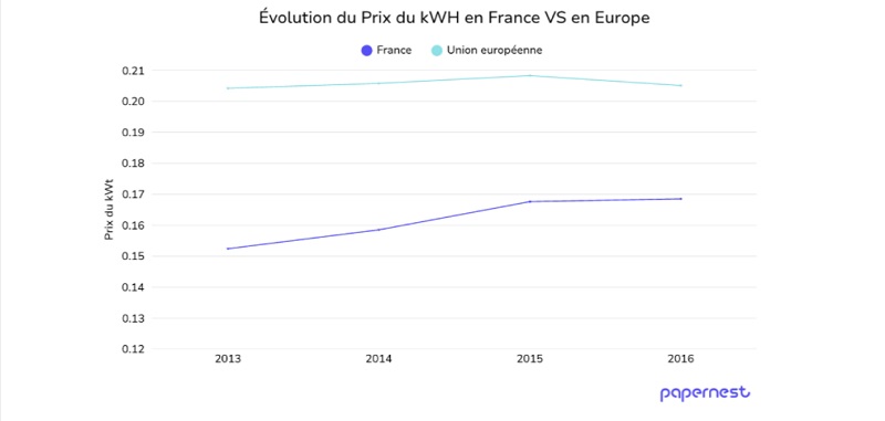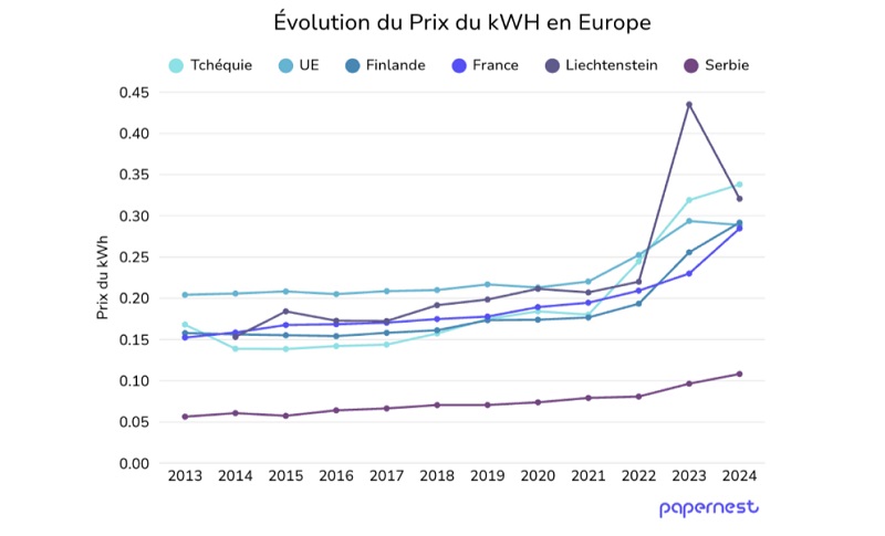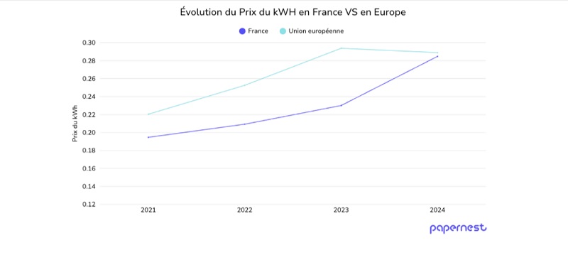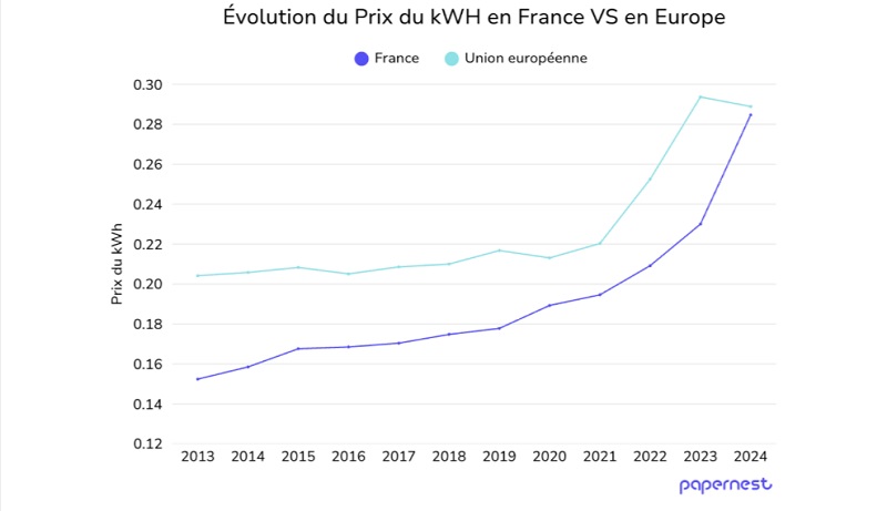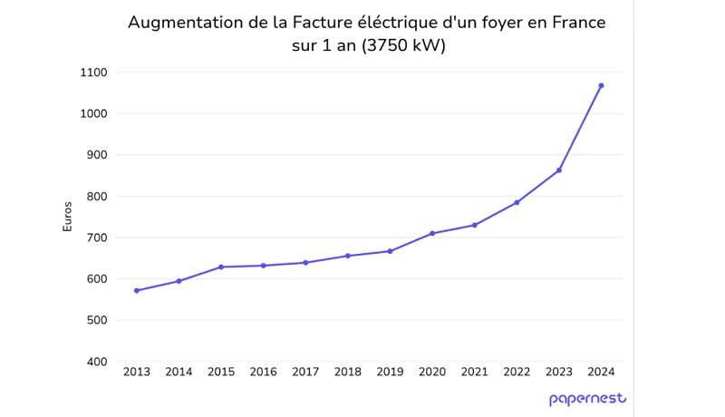 En dix ans, le prix du kWh a grimpé de 0,15 € à 0,28 € en France, soit une hausse historique de +86 %. Longtemps protégée par son parc nucléaire, la France perd désormais son avantage compétitif et rejoint la moyenne européenne. Pour les ménages, la conséquence est immédiate : une facture d’électricité quasiment doublée, qui fragilise le budget au quotidien et interroge sur la soutenabilité du modèle énergétique français. Le récent rapport « Électricité en France : +86 % en 10 ans, un choc pour les foyers », publié par Papernest, éclaire les mécanismes — taxes, crises, marché européen et performance du parc nucléaire — derrière cette flambée tarifaire.