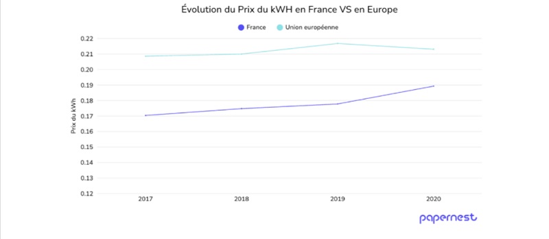 “ Les prix présentés correspondent aux prix moyens annuels nationaux de l’électricité, exprimés en euros par kWh. Ils intègrent l’ensemble des composantes facturées : coûts de l’énergie, de la fourniture et du réseau, ainsi que la TVA et les autres taxes.”