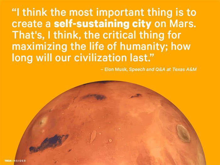 Pour Elon Musk, le milliardaire hyper créatif, cela ne fait aucun doute. Si nous voulons sauver l’humanité, il faut être en mesure d’envoyer un million de personnes vers Mars pour coloniser la planète rouge. C’est pour cette raison qu’il a créé, en 2008, la société d’aérospatiale Space X et continue à développer des fusées de nouvelle génération.