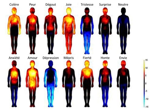 Les couleurs chaudes, rouge, jaune, désignent les zones suractivées par les émotions. Le bleu, couleur froide, désigne les zones du corps donc l’activité s’affaiblit ou ralentit avec l’émotion.
