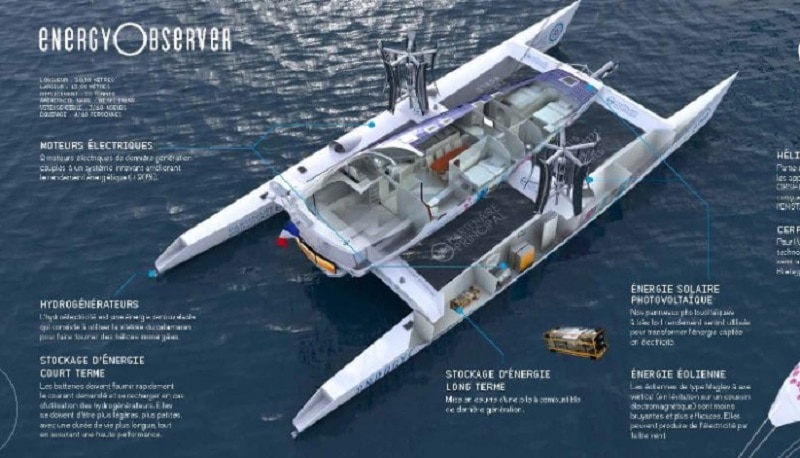 Energy Observer a d’abord été un compétiteur de renom. Construit en 1983 au Canada, recordman du Trophée Jules Verne, l’ancien Formule TAG a été le premier voilier à franchir la barre symbolique des 500 milles en 24 heures. Depuis 2015, c’est une équipe de près de 50 personnes, composée de navigateurs, d’architectes et d’ingénieurs partout en France, qui travaille sur le reconditionnement de ce catamaran de plus de 30 mètres de long et de 12,80 mètres de large.