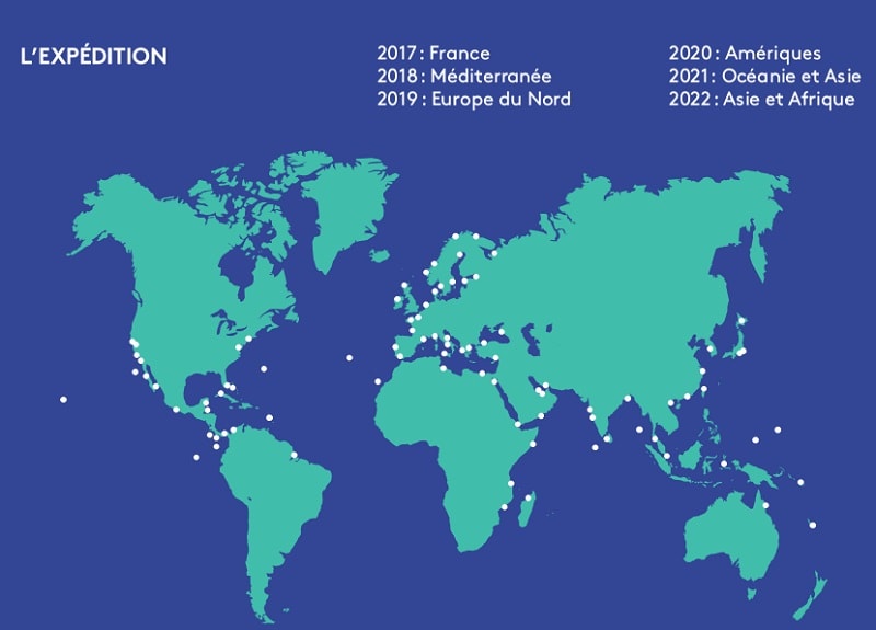 Six ans de navigation sans une goutte de carburant fossile, 101 escales à travers le monde prévues entre 2017 et 2022 dans les capitales maritimes, les ports historiques, les réserves naturelles ou lors de grands événements internationaux… Cette odyssée à bord d’un laboratoire flottant en milieu extrême est incarnée par Victorien Erussard, coureur au large et officier de marine marchande, et Jérôme Delafosse, explorateur et réalisateur de documentaires.