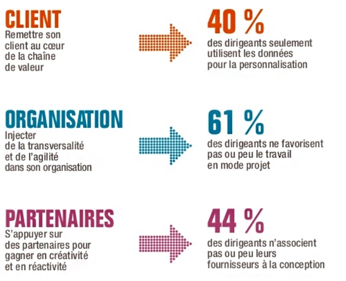 « Une entreprise sur cinq est condamnée à disparaître si elle ne fait rien [pour se mettre à l’ère du numérique] d’ici trois ans » affirme la dernière étude du Lab de BpiFrance. Seules 27 % des PME et ETI déclarent s’être « fortement ou très fortement » engagées dans des actions pour leur adaptation au numérique, près du tiers n’a toujours rien fait en la matière et 87 % des dirigeants français ne voit pas de priorité stratégique au numérique. Manque d’ouverture et logique de silos ?