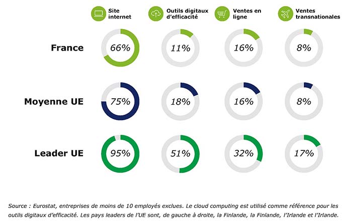 Cela traduit un retard par rapport à la moyenne européenne et pose donc la question de la compétitivité française : « En France, deux PME sur trois bénéficient d’un site Internet. La France accuse un retard par rapport au reste de l’Union européenne où trois PME en moyenne sur quatre » ont un tel site [7]. Et si les PME françaises pratiquent d’autant moins le e-commerce qu’elles sont petites, ce n’est pas le cas des très petites entreprises allemandes qui sont à égalité avec les PME. Il n’y a donc pas de fatalité induite par la taille. En revanche, « les PME françaises ayant initié ou réalisé leur transformation digitale sont trois fois et demie plus susceptibles d’exporter que la moyenne des PME françaises ».