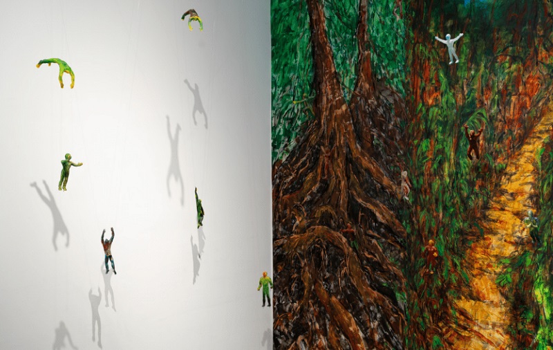 L’artiste est donc revenue sur ses pas. Pour cette création à la Maison de l’Amérique latine, elle propose un ensemble associant une nouvelle fois pastels, sculptures, son, et une vidéo. Mais son installation résonne de façon différente. […] À la fois belle et menaçante, la luxuriance de la végétation est créatrice de malaise. Dans une telle nature, note De Obaldia, on perd toute espèce de repères : « c’est cela que je cherche à rendre », ajoute celle qui, pour avoir été l’invitée en 2023 du Smithsonian Tropical Research Institute de Barro Colorado, réserve naturelle insulaire au cœur du canal du Panama, connaît bien la jungle. Sur un mur de l’espace d’exposition, quatre dessins collés les uns aux autres tombent sur trois mètres cinquante, du plafond jusqu’au sol. Leur verticalité résulte de l’expérience, dans un terrain où les arbres prospèrent en se dressant très haut : « Dans la jungle […] tout semble vertical. On passe la plupart du temps à regarder vers le haut » commente De Obaldia — en 2023, elle avait présenté au Musée du canal un Paysage vertical (Vertical landscape ) de 9 mètres de haut. Les quatre feuilles pourraient représenter les étapes d’un parcours. La première figure la mangrove : les racines des palétuviers plongent en rhizomes dans un sol boueux, faisant sentir la pesanteur d’un monde où l’homme n’est pas bienvenu. La deuxième montre une piste qui, loin dans le haut, débouche sur un éclat de ciel : l’espoir, pourvu que ceux qui tentent leur chance ne perdent pas ce chemin que la croissance végétale occulte. Une cascade occupe la troisième, et la dernière laisse apercevoir la côte, le terme provisoire de l’épreuve. […] Suspendues au plafond, des figures de verre se balancent devant ces grandes peintures. Elles sont colorées, diverses, nombreuses comme le furent les migrants ; petites — leurs dimensions donnent la démesure de la nature autour d’eux ; d’un fini délicat ; et saisies dans des attitudes dynamiques — au bout des fils ténus auxquels elles sont suspendues, leurs gestes révèlent des émotions. […] Pour les corps de Selva, De Obaldia avait adopté une technique mixte inspirée du moulage au sable (sand casting) dont elle connaît bien le procédé, et de la fonte à la cire (lost-wax casting).