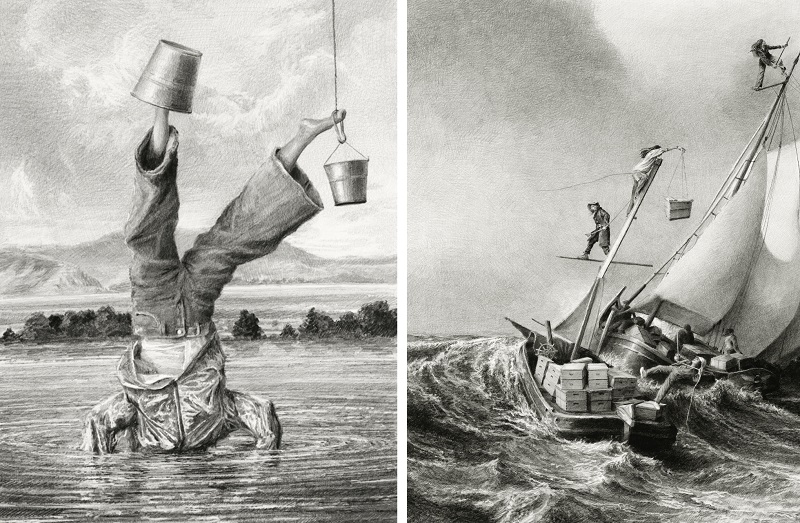 « Je voulais montrer un groupe de personnes unies par un objectif commun », explique-t-il. Dans son dessin Agriculturalists, Murrow transforme une entreprise collective éminemment américaine, la construction d’une grange en bois en un geste à la fois héroïque et chimérique. Trois personnages — dans une composition qui évoque la célèbre photographie de Joe Rosenthal où des marines hissent le drapeau sur Iwo Jima — unissent leurs forces pour dresser une tête de licorne au-dessus d’un tas instable de bottes de foin perchées sur un éperon rocheux. La scène renvoie au moment du « topping out » lorsque les constructeurs célèbrent l’achèvement d’une grange en plaçant un symbole porte-bonheur au point le plus élevé de la structure, pour honorer le travail et le savoir-faire partagés.
