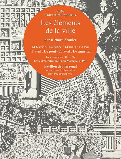 Le Pavillon de l’Arsenal organise un nouveau cycle de conférences de l’Université Populaire pour 2026 sur le thème « Les éléments de la ville : la place, la rue, le pont, le quartier », par l’architecte, philosophe et professeur Richard Scoffier, les samedis de 11h à 13h.