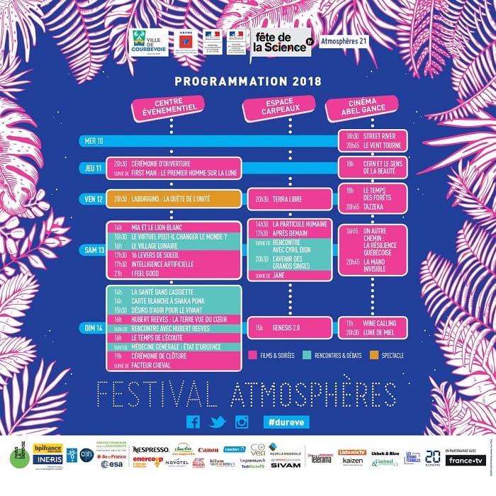 Rêver le 21ème siècleCaresser l’espoir d’un monde meilleur : voici bien un rêve qui n’a jamais cessé de nourrir l’imaginaire de l’humanité.Mais qu’est-ce qu’un monde meilleur ? Est-ce celui où nous pourrions nous affranchir de la pauvreté, des maladies, de la mort et des inégalités ? Un monde sans haine ? Ou encore un monde où nous pourrions nous déplacer dans l’espace interstellaire à la vitesse de la lumière ?Est-ce un monde virtuel où les humains pourraient s’échapper du réel ? Un monde qui ne menacerait plus d’extinction les animaux et les plantes et relèverait le défi climatique ? Serait-ce un monde où l’intelligence artificielle nous aiderait à prendre les bonnes décisions ? Mais qu’est-ce qu’une bonne décision ?Nous sommes à l’heure des choix, et le Festival Atmosphères vous propose d’explorer tous les possibles car comme l’écrivait le poète et homme politique Aimé Césaire : « Le rêve est le moteur de la réalité ».Nous remercions la ville de Courbevoie, la « Fête de la Science » et l’ensemble de nos partenaires pour leur implication essentielle dans cette huitième édition ainsi que nos formidables parrains Michel Spiro, Pierre Richard, Sébastien Folin et tous les artistes, personnalités et professionnels qui nourrissent précieusement cet événement, sans oublier les milliers de festivaliers et scolaires chaque année plus nombreux.L’équipe du festival »