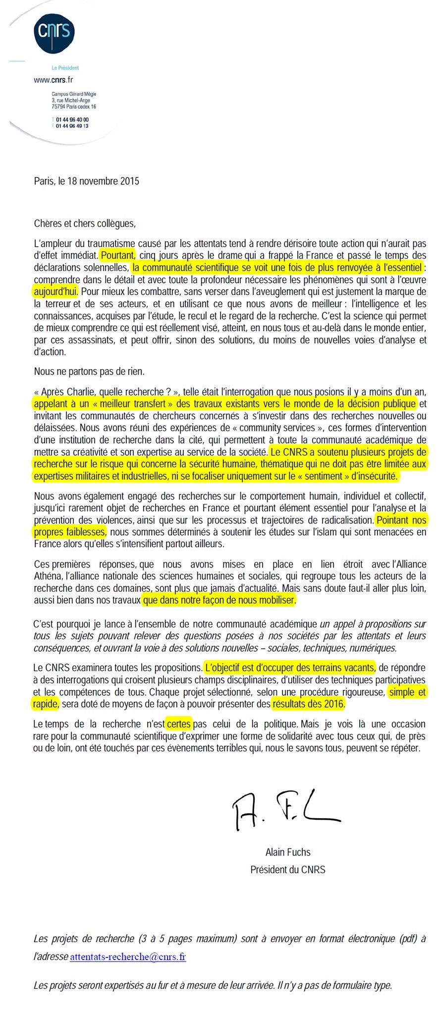 Trois jours après les attentats de Paris, le patron du Centre national de la recherche scientifique invite ses collègues à proposer « tous les sujets pouvant relever des questions posées à nos sociétés par les attentats et leurs conséquences, et ouvrant la voie à des solutions nouvelles – sociales, techniques, numériques ». « C’est la science qui permet de mieux comprendre ce qui est réellement visé, atteint, en nous tous et au-delà dans le monde entier, par ces assassinats, et peut offrir, sinon des solutions, du moins de nouvelles voies d’analyse et d’action », écrit-il dans un courrier dont nous reproduisons une copie à la fin de cet article.