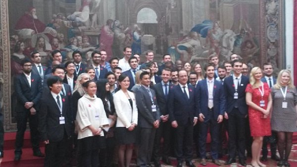 François Hollande et Emmanuel Macron, en présence de Bruno Julliard, l’adjoint au maire d’Anne Hildago chargé de la culture, et d’Harlem Désir, secrétaire d’Etat au Développement international, acueillaient à l’Elysée ce mercredi 2 mars les 50 entrepreneurs étrangers lauréats de la première saison.