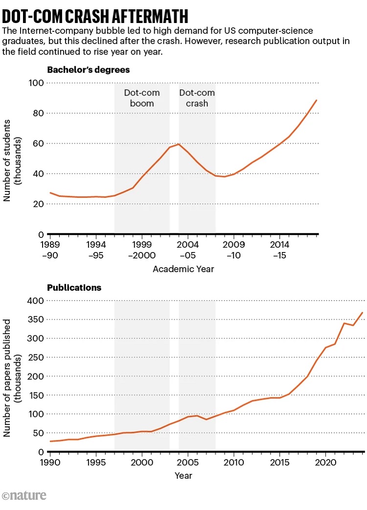 La bulle Internet a entraîné une forte demande pour les diplômés américains en informatique, mais celle-ci a diminué après le krach. Cependant, le nombre de publications de recherche dans ce domaine a continué d’augmenter d’année en année (Sources : National Center for Education Statistics; rapport de l’Artificial Intelligence Index, 2025) :