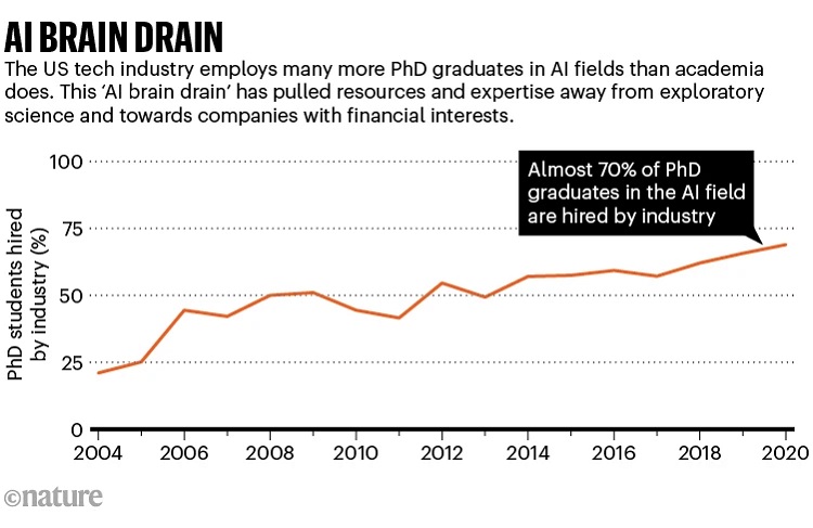 L’industrie technologique américaine emploie beaucoup plus de titulaires d’un doctorat dans le domaine de l’IA que le monde universitaire. Cette fuite des cerveaux dans le domaine de l’IA a détourné les ressources et l’expertise de la science exploratoire vers des entreprises ayant des intérêts financiers (Source : Nur Ahmed, N. et al. Science 379 884-886, 2023). Résultat : près de 70 % des titulaires d’un doctorat dans le domaine de l’IA sont embauchés par l’industrie :