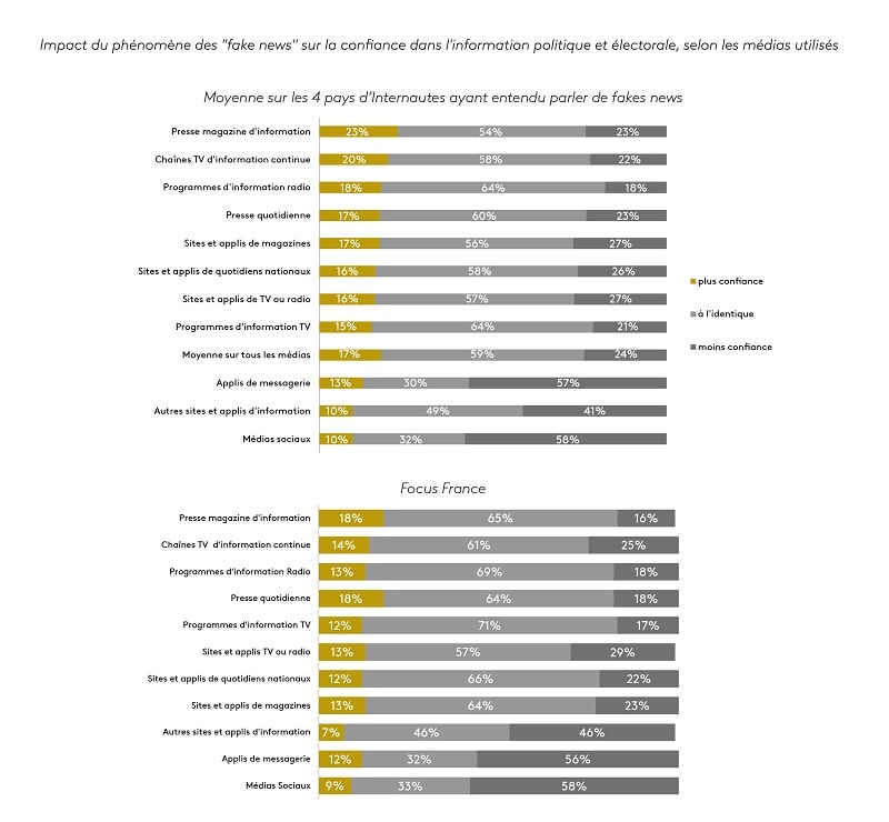 La campagne de « fake news » a principalement affecté les réseaux sociaux, 58% déclarant leur faire moins confiance. La réputation des sites d’information en ligne et Pure Players a également été significativement affectée.  41% des sondés disent leur faire « moins confiance ». Un chiffre plus élevé en France avec 46,5% des sondés.