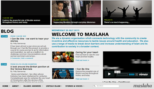 Maslaha est un site participatif créé à la demande d’adolescents britanniques musulmans qui souhaitent avoir un espace pour demander des conseils sur les dilemmes auxquels ils sont confrontés dans leur vie quotidienne pour vivre leur religion. C’est un espace social qui leur permet d’échanger et de recevoir des réponses simples à leurs problèmes comme, que fait-on si on est diabétique pendant le ramadan… « Encore une idée simple qui tente de relever des aspirations humaines et d’humaniser la technologie ».