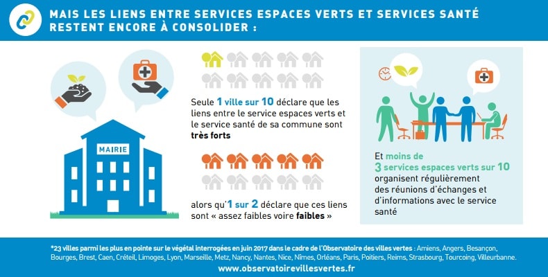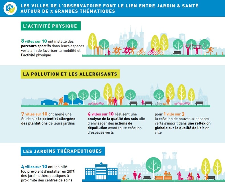 Parmi les principaux enseignements de cette enquête, on constate que si les collectivités sont moteur de leur transition globale vers des espaces verts plus « sains », elles ne prennent pas encore suffisamment en compte le critère de la santé dans leurs réflexions et leurs projets. Certaines villes se distinguent toutefois : Paris, Lyon, Nantes, Caen et Metz sont précurseurs en la matière, avec de nombreuses actions mises en place, telles que la création de jardins thérapeutiques, le développement de parcours sportifs, ou encore la création de nouveaux jardins pour améliorer la qualité de l’air.