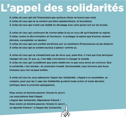 En faisant l’Appel de toutes celles et ceux qui défendent la solidarité comme un préalable à toute action politique. En faisant l’Appel de la majorité discrète mais résolument solidaire qui œuvre chaque jour, et l’encourager à se revendiquer comme telle.