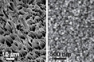 Ces images de microscope électronique à balayage, prises à différents grossissements, montrent la puissance de ces nouveaux hydrogels en nanoparticules, interagissant avec de ongues chaînes de pokymères (Crédit photo : ©Eric Appel et Nature Communication)