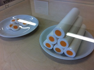 Instinctivement, l’objet paraît peu alléchant. Pourtant, il n’est que le fruit d’un procédé de cuisson. Les oeufs durs en barre résultent d’un dispositif de fabrication qui consiste à séparer les blancs des jaunes pour les cuire dans des moules cylindriques et les réassembler ensuite. Ce procédé est utilisé dans l’industrie de la restauration qui doit fournir des salades, sandwichs et autres plats avec des tranches d’oeufs comportant une part égale de blanc et de jaune. Le design intervient alors pour proposer une solution simple à un problème économique (réduction du gaspillage) et esthétique (tranches uniformes) en altérant peu la qualité du produit. Parce qu’il nous paraît repoussant, l’oeuf en barre continue de nous interroger : qu’est-ce qui en lui nous dérange ?