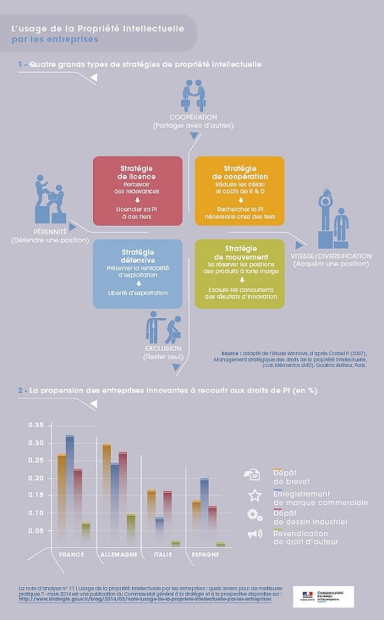Sur ce plan, si les entreprises continuent d’utiliser les droits de PI principalement dans une optique défensive, elles s’en servent aussi de plus en plus et de manière complémentaire à d’autres fins : pour innover en partenariat (stratégie de coopération), pour préempter certains marchés (stratégie de mouvement) ou pour percevoir des redevances (stratégie de licence).