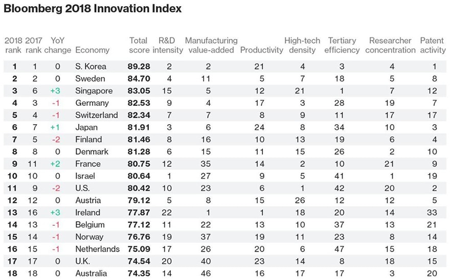 En tête de classement, la Corée du sud conserve sa place grâce notamment à son fleuron technologique Samsung. Singapour se hisse à la troisième place en raison de son système éducatif en science et en ingénierie et ses investissements massifs dans la recherche. De ce fait, elle fait reculer l’Allemagne à la quatrième position.