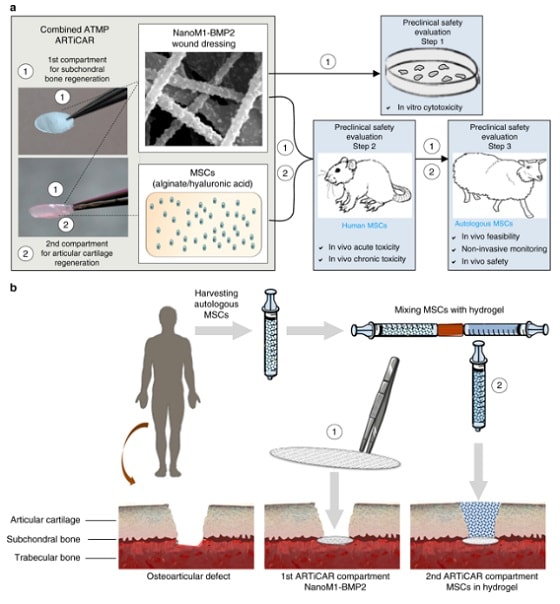 Médicament composite de thérapie innovante (ATMP) développé pour la régénération ostéoarticulaire (OAR) des lésions focales du cartilage qui combine un pansement synthétique et un traitement vivant constitué de cellules souches mésenchymateuses autologues (CSM), enrobées dans un hydrogel alginate/acide hyaluronique qui, lui, vise la régénération du cartilage articulaire.