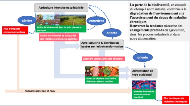 La perte de biodiversité dans les sols, dans les plantes et les paysages, génère un besoin élevé en engrais et pesticides de synthèse souvent nocifs pour l’environnement et notre santé. Elle est aussi associée à une faible diversité de productions agricoles et réduit la densité nutritionnelle des produits. Ces problèmes interreliés sont en outre entretenus ou amplifiés par l’agro-industrie dont certains procédés physicochimiques réduisent encore la valeur santé de nombreux aliments. Il en résulte une offre alimentaire favorisant la « malbouffe », réduisant la diversité de notre microbiote intestinal et augmentant ainsi le risque de maladies chroniques.