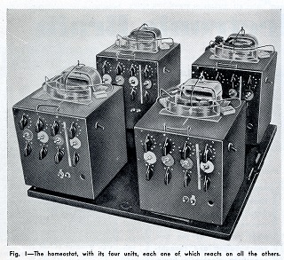 Pour l’illustrer, Ashby a conçu l’homéostat, un dispositif intelligent composé de quatre unités interconnectées de contrôle de bombes de la RAF – de mystérieuses boîtes noires avec beaucoup de boutons et de commutateurs sensibles aux fluctuations de tension. Si une unité cesse de fonctionner correctement – par exemple, en raison d’une perturbation externe inattendue – les trois autres sauraient se recâbler et se regrouper pour compenser le mauvais fonctionnement de façon à maintenir stable la production globale du système.