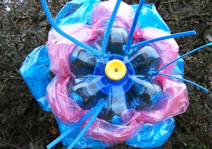 Œuvre de Ghislaine Letourneur « Déchets plastiques valorisation PET – Fleur plastique bleue et rose » – Objet Art Création recyclage Waste plastic